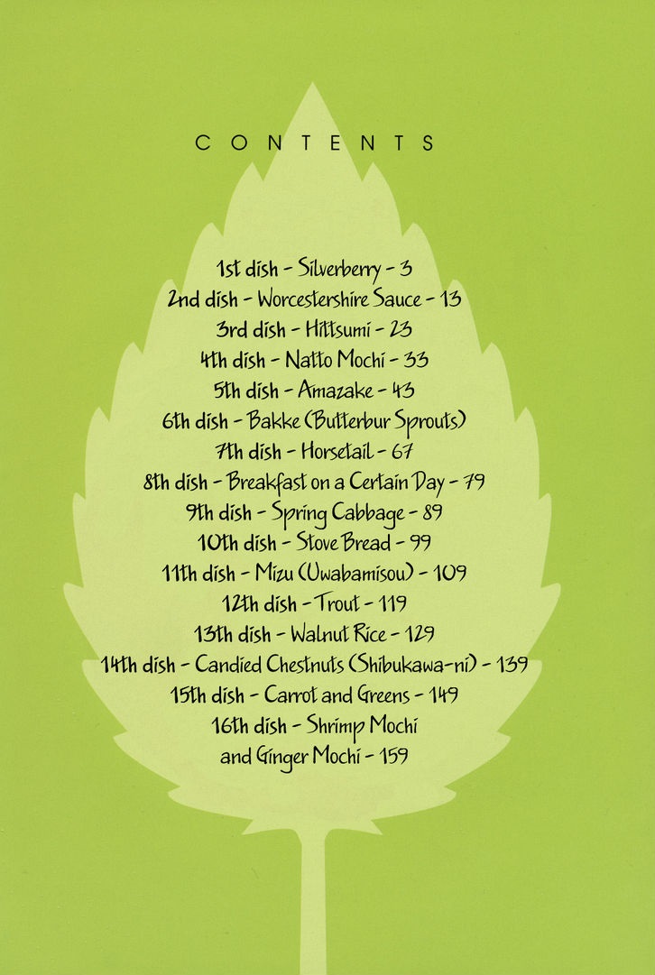 Curiosamente todos os capítulos são nomeados como receitas típicas ou nem tanto do Japão, não sem lógica, pois sempre nos é apresentado a respectiva receita sendo elaborada e explicada pela protagonista, não apenas o preparo mas a coleta de cada ingrediente além da forma de plantio e outras dicas! Muito útil para aprender sobre a culinária e cultura japonesa, por exemplo, tempo úmido é muito bom para fazer pães.