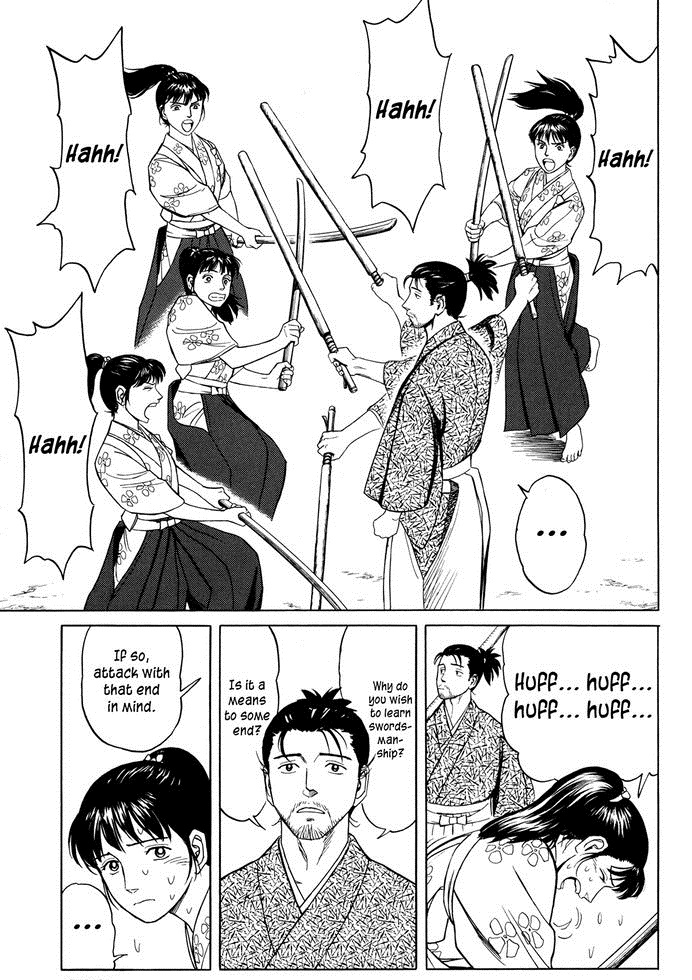 Motivada pelo desejo de vingança, Haruna nutre o desejo de aprender o manuseio da espada. Para tanto, pretende utilizar o dinheiro furtado dos criminosos. Ela visita o dojo do famoso e renomado espadachim Nobutsuna Kamiizumi, considerado o maior espadachim da época, para aprender kenjutsu. Só para mencionar, Nobutsuna Kamiizumi existiu de verdade e foi um dos maiores praticantes de kenjutsu da história, a ele também foi creditada a invenção da shinai, a famosa espada de bambu utilizada nos treinamentos.