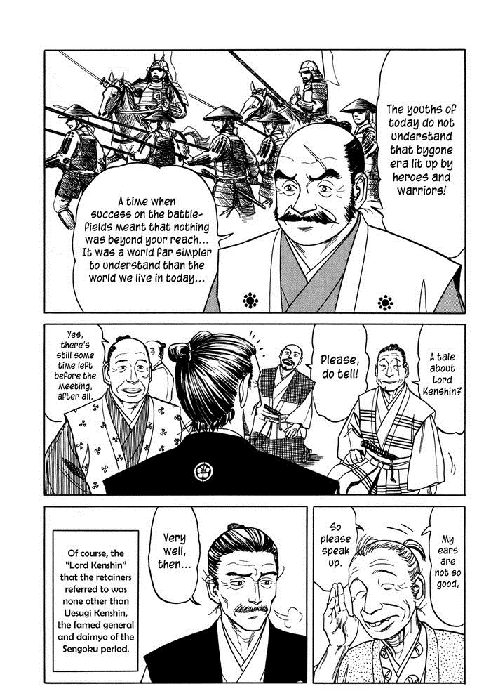 Então vamos começar por Yuki no Touge, ou Snowy Ridge em inglês, o que pode ser traduzido como Cume Nevado. Esse título faz referência a travessia da montanha de Uesugi Kenshin, um daymio (nobre japonês), famoso por suas proezas militares, que é muito citado nesta estória, servindo como um modelo de bom governador para as futuras gerações, mesmo que eventualmente tenha cometido atitudes cruéis.
