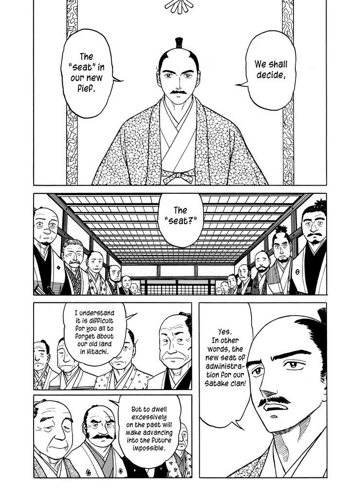 Yoshinobu Satake era um líder sábio, mas dependia dos conselhos de seus súditos, ainda mais por ter sua capacidade de decisão questionada quando preferiu apoiar o opositor de Tokugawa, o que custou a perda de suas terras natais. Entretanto, esta decisão pode ter sido mais sábia do que todos pensam, talvez ser aliado de Tokugawa também não se mostrasse algo vantajoso, visto que o clã Satake era muito poderoso e estava exatamente na fronteira do clã Tokugawa. Ainda assim, a palavra de Yoshinobu Satake deveria escolher a nova localização do castelo.