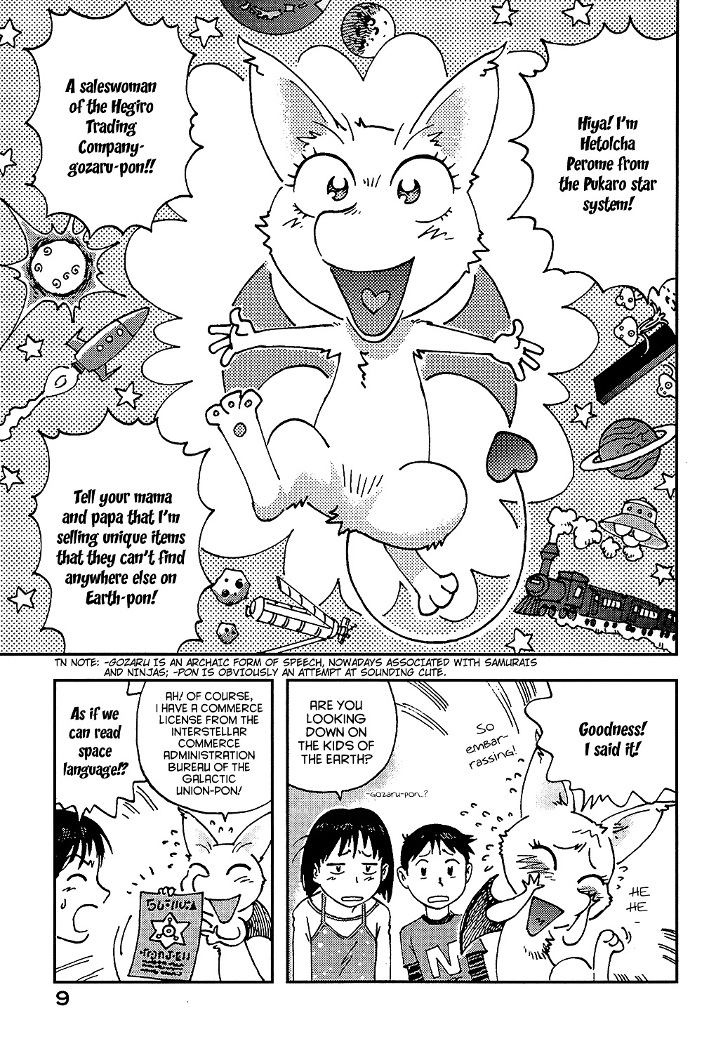 Esta criatura acaba acompanhando os dois até em cada, e para a surpresa dos irmãos, ela revela ser uma comerciante intergaláctica, que estava visitando a Terra para vender tecnologias avançadas em troca de uma substância chamada hahise, que por sinal, é abundante na Terra. Reiko e seu irmão acabam ajudando a criatura, que parecia cansada e faminta. Inicialmente, eles não deram muita bola para o fato da criatura vender alguma coisa, já que estavam mais preocupados em manter Ponko como um bichinho de estimação, tendo o trabalho de escondê-la de seus pais.