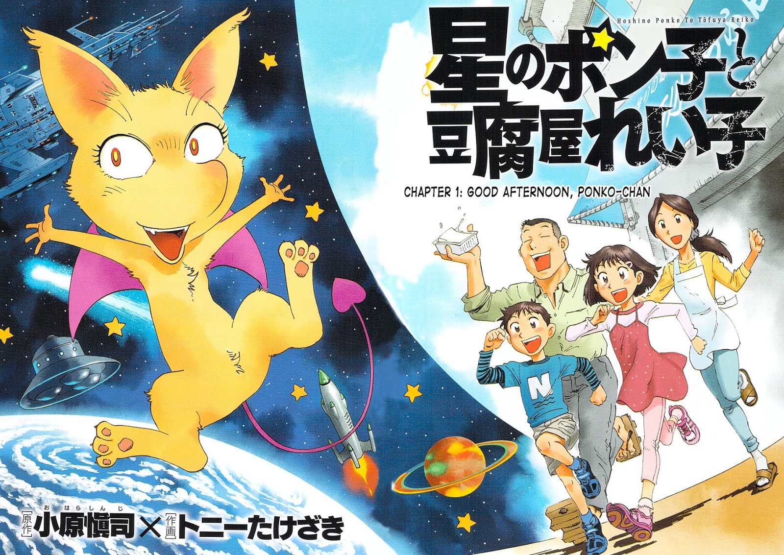Ponko Of The Stars And Reiko Of The Tofu Shop é um mangá one-shot, publicado de agosto a outubro de 2013, possuindo apenas três capítulos, o que faz deste um mangá bem curto. O título original em japonês é Hoshi no Ponko to Toufuya Reiko. Foi publicado na famosa revista seinen Afternoon (Vinland Saga, Blame!, Parasyte, Blade of the Immortal, Eden: It’s an Endless World!, entre outras.). Este mangá possui uma autoria dupla. Quem ficou responsável pelo enredo foi Shinji Ohara, e o responsável pela arte é Tony Takezaki.