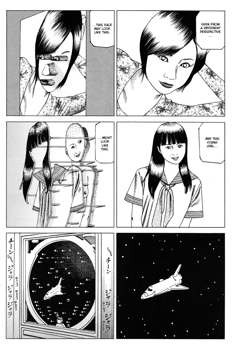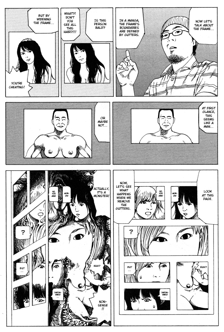 Depois da editora afirmar a impossibilidade de aplicar a manipulação narrativa em mangás, Shintaro kago inicia uma longa exposição desmentindo o argumento. A manipulação narrativa funciona em mangás justamente em virtude da existência dos quadros, os quais podem esconder informações valiosas. Por exemplo, em um quadro uma moça parece viva e sorridente e não podemos ver o seu corpo da cintura para baixo. Contudo, na verdade ela foi partida ao meio.