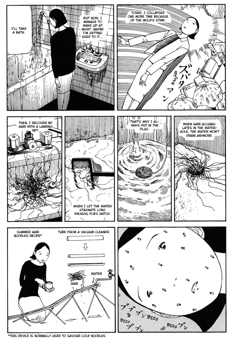 Estas obras curtas são bastante variadas. A primeira é Back from the Front, a qual parece uma obra de Suehiro Maruo, provavelmente Kago se inspirou nele para desenhá-la. Esse conto é sobre um soldado que volta totalmente incapacitado da guerra e a esposa faz ele dele gato e sapato enquanto tenta desesperadamente se satisfazer sexualmente. Nem sei se essa é uma sinopse digna, mas é muito difícil definir esse conto, apenas leiam! Depois temos Tremors, mostrando Kago em sua melhor forma, numa estória onde todo mundo, de forma misteriosa, começa a tremer até desaparecer.
