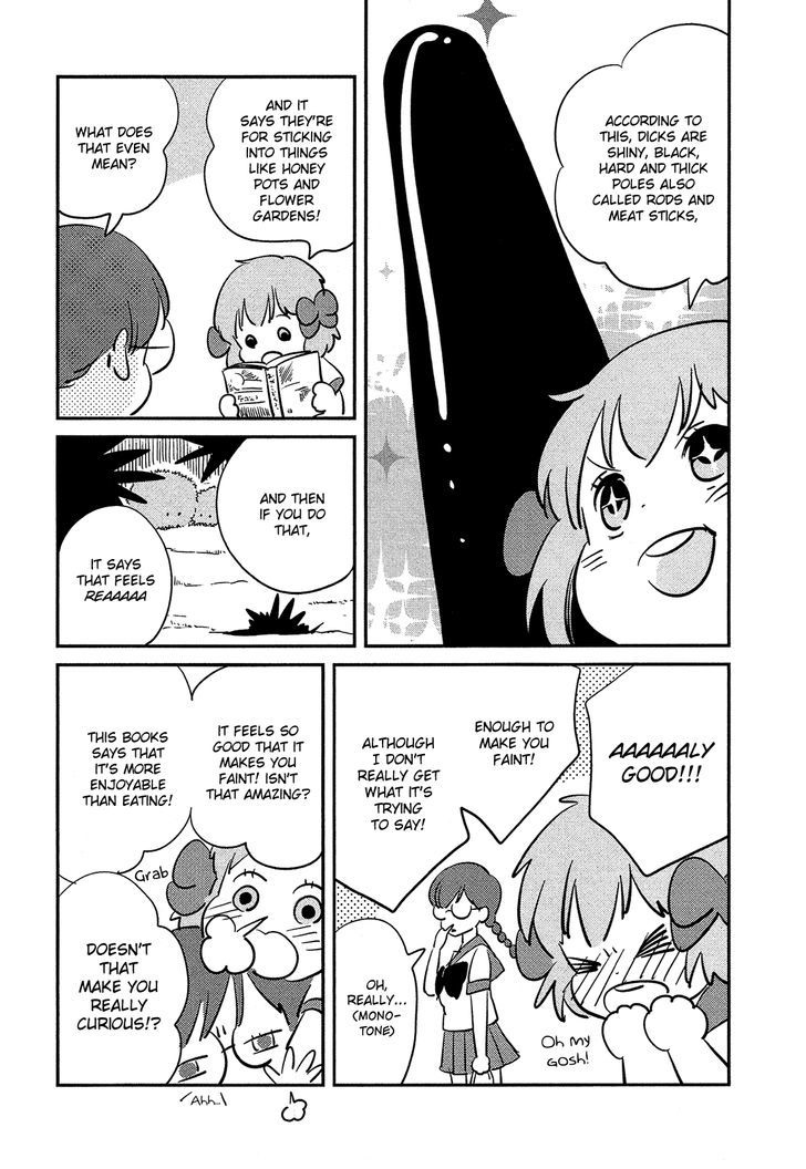 Vocês devem estar se perguntando, se elas não sabem o que é um pênis, como se reproduzem? Não entrarei em spoilers, mas posso dizer que elas possuem uma espécie de ritual de inseminação. Mas isso não é tudo, o que mais chama a atenção é a “colorida” imaginação da ingênua Sakura, que imagina o pênis sendo uma espécie de grande poste negro e lustroso, com a capacidade de voar, curar doenças, e outros atributos fantásticos! Sakura chega ao ponto de inventar uma dança do pênis, transformando isso em um culto bizarro de adoração fálica.