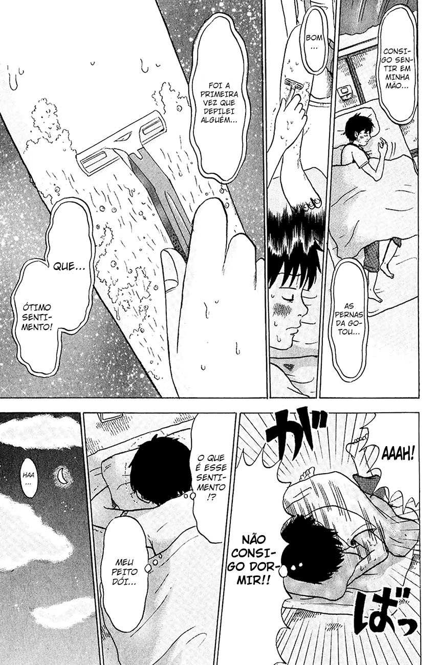 Tudo é uma questão de confiança e parceria, Gotou só confia em Ota para resolver o seu problema. O interessante é que os sentimentos de ambos ficam bastante confusos, já que aparentemente não possuem experiências sexuais prévias, e o ato de depilar, que é algo bastante íntimo, possui um viés erótico para ambos. É simplesmente hilário ver a maneira como Ota reage com os pedidos cada vez mais ousados de depilação, começando pelos braços, indo pelas pernas, depois as axilas, e bem, vocês devem imaginar o que o pobre do Ota pensou que teria que depilar posteriormente né? Ainda mais pelo que ele já havia visto enquanto a Gotou nadava, seus pelos pubianos escapando do maiô, o que fez o moleque entrar em frisson.